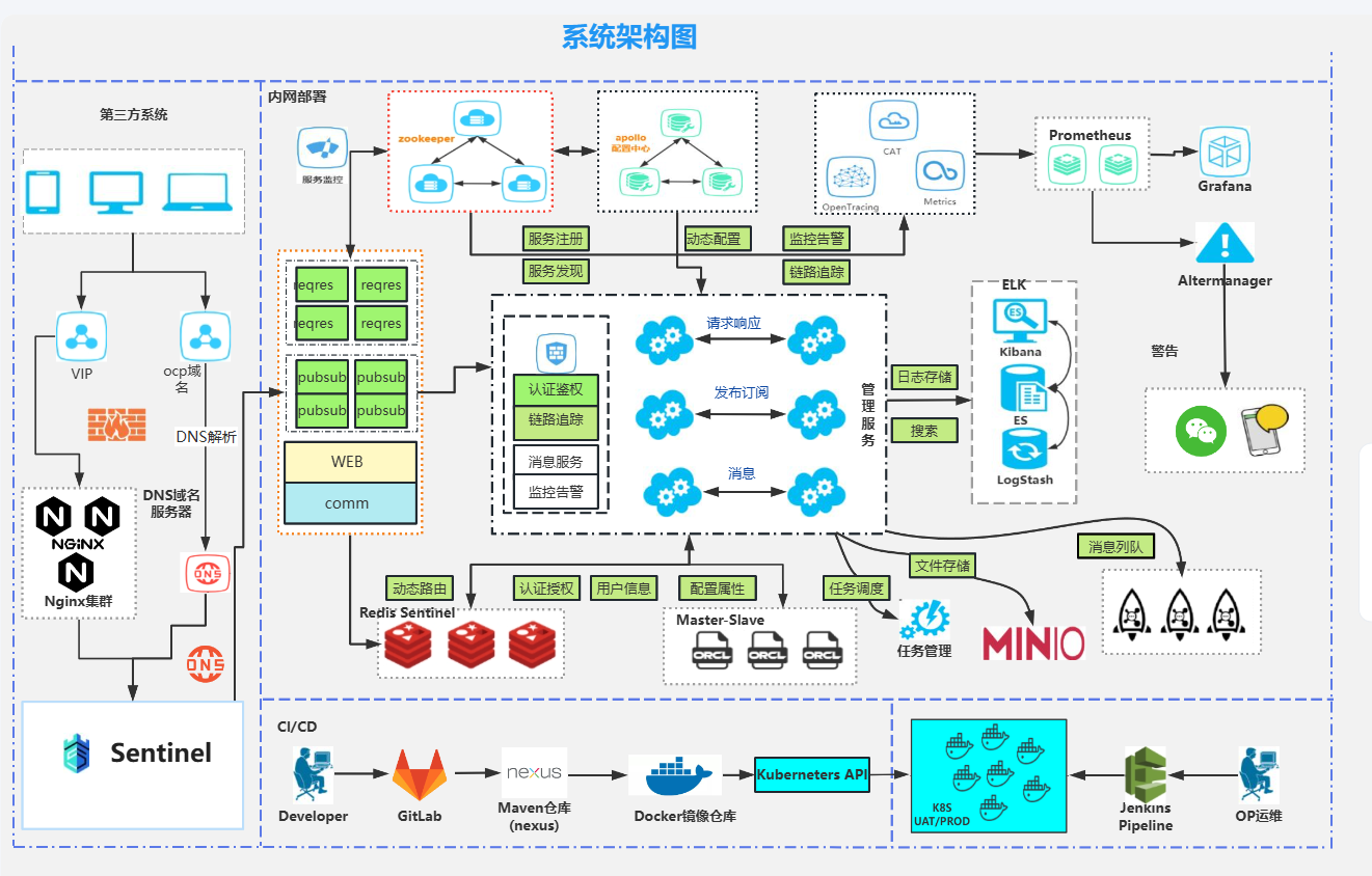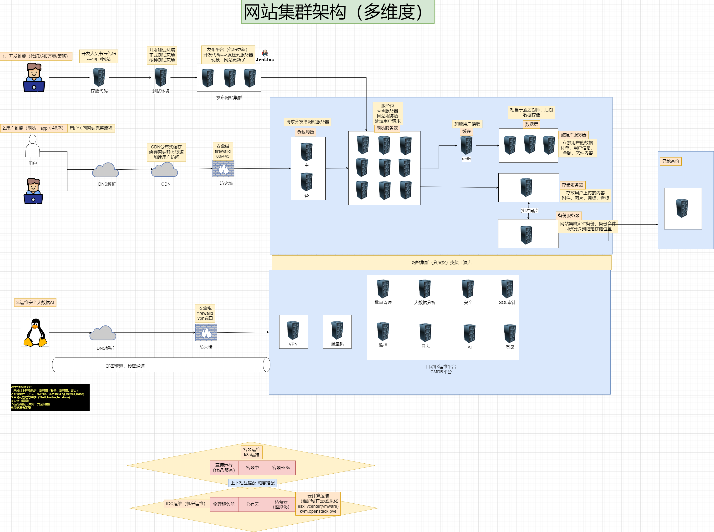 - 开发人员提交代码后,经 “预发布环境” 测试验证,再通过 “发布网(代理解析)” 和自动化工具(如 Jenkins),将版本发布到 “生产网集群”。